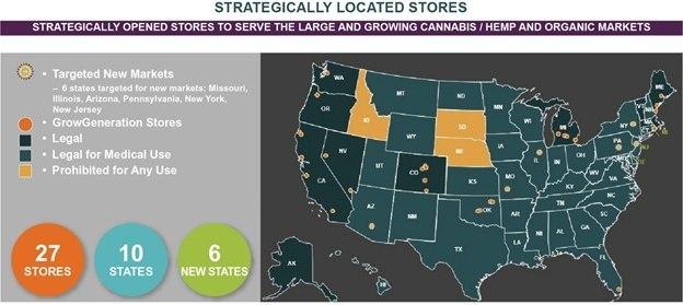 We believe we are the largest chain of stand-alone hydroponic garden centers by revenue and number of stores in the United States. We also believe we are a leading marketer and distributor of nutrients, growing media, advanced indoor and greenhouse lighting, ventilation systems and accessories for hydroponic gardening, based on management’s estimates. We have a diverse customer base, with commercial customers constituting the majority of our total sales. As of June 23, 2020, we own and operate a chain of 27 retail and commercial hydroponic/gardening centers in 10 U.S. states. We also operate an online e-commerce store, growgeneration.com. Our core strategy continues to focus on expanding our geographic reach across the United States through organic growth, in terms of increasing same store sales and expanding customer base, and acquisitions.