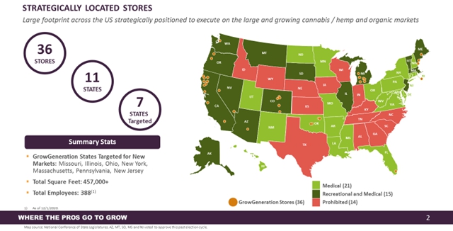 We believe we are the largest chain of stand-alone hydroponic garden centers by revenue and number of stores in the United States. We also believe we are a leading marketer and distributor of nutrients, growing media, advanced indoor and greenhouse lighting, ventilation systems and accessories for hydroponic gardening, based on management’s estimates. We have a diverse customer base, with commercial customers constituting the majority of our total sales. As of December 1, 2020, we own and operate a chain of 36 retail and commercial hydroponic/gardening centers in 11 U.S. states. We also operate an online e-commerce store, growgeneration.com. Our core strategy continues to focus on expanding our geographic reach across the United States through organic growth -- both by increasing same store sales and by opening new stores -- as well as inorganically via acquisitions.