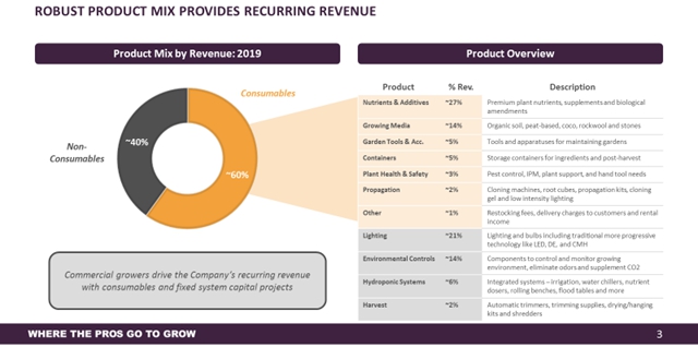We sell a variety of products, including nutrients, growing media, advanced indoor and greenhouse lighting, ventilation systems, and accessories for hydroponic gardening, as well as other indoor and outdoor growing products. Our supply chain includes several thousand stock keeping units (“SKUs”) across 12 product departments. Many of our products are consumables leading to repeat orders by our customers. Consumable products are mainly nutrients and additives that feed the plants on a recurring basis. Our strategy is to supply products to two groups of customers: commercial growers and smaller growers that require a local center to fulfill their daily and weekly growing needs.