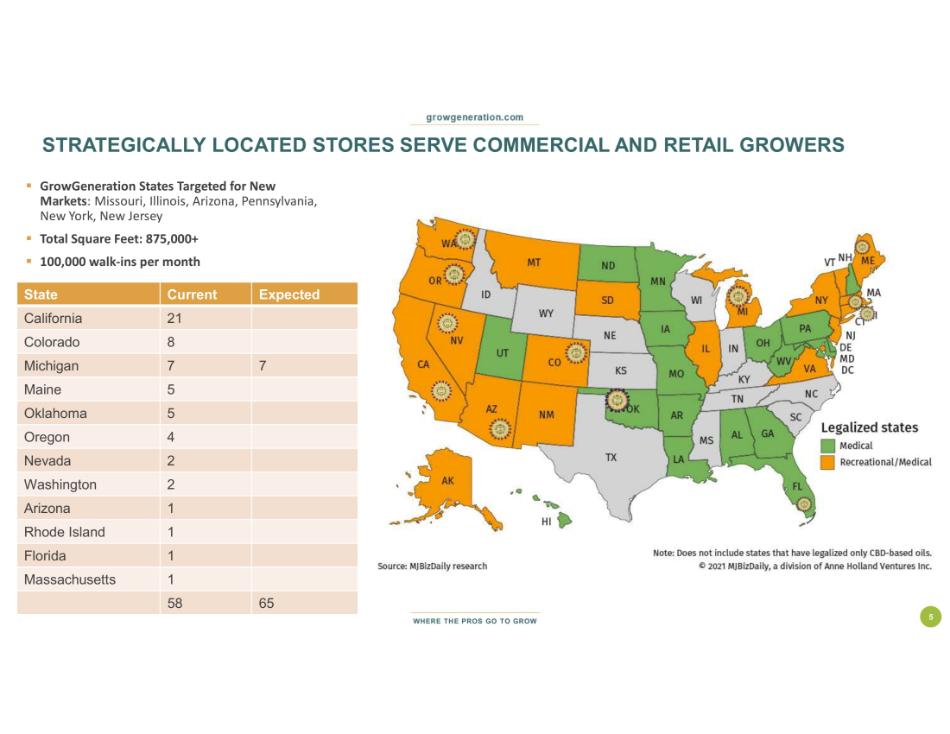 WHERE THE PROS GO TO GROW CONTROLLED E N VI R O NM E NT AGRICULTURE 4 • GrowGeneration products help control the indoor environments and allow for 24/7 growing that is not dependent on weather • Allows multiple harvests in any weather environment • Significant reduction in water and other resources creates sustainable and resource efficient environment • Delivering Nutrients, Hydration and Photosynthesis plants need • Technology Platform delivering ongoing Data and Advanced Lighting growgeneration.com