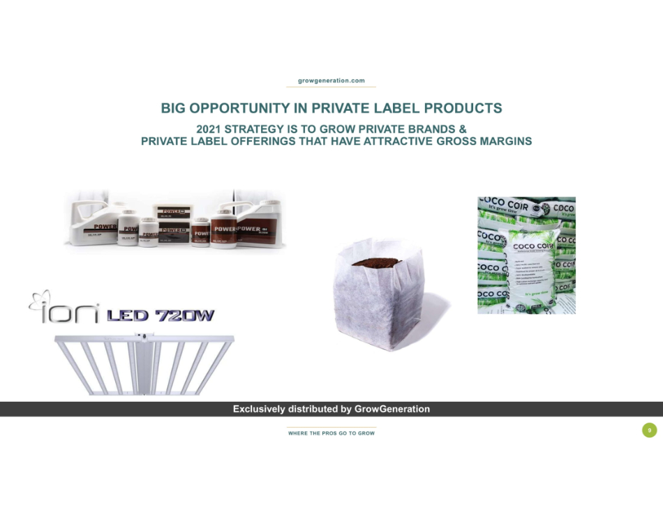 growgeneration.com ROBUST PRODUCT MIX PROVIDES RECURRING REVENUE Product Mix by Revenue: 2020 Product Overview Non - Con s u m a b l e s Con s u m a b l e s ~60% 8 WHERE THE PROS GO TO GROW ~40% ▪ Consumables include nutrients soils and additives ▪ Non Consumables include lights, benching, and environmental control systems