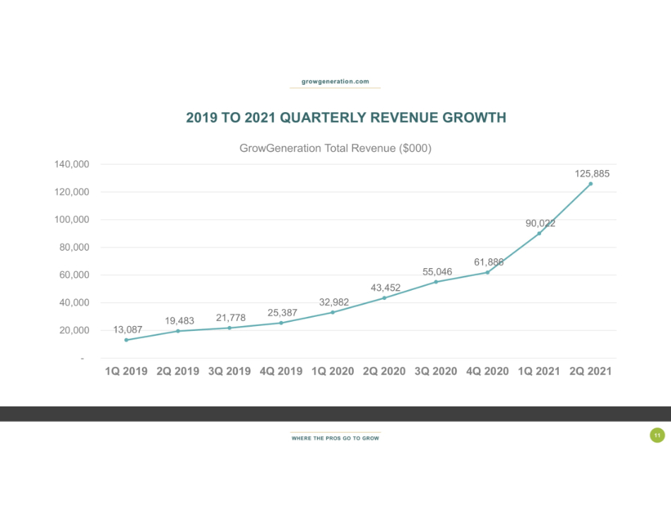 Projected Revenue FINANCIAL HIGHLIGHTS $ in millions growgeneration.com 2 0 1 7 20 18 2 0 1 9 2 0 2 0E 20 2 1 E $ 80 $29 $ 1 9 3 2021 YTD Revenue $216m Q2 2021 Revenue $126m Same Store Sales +60% Vs $193 million +$43 million Q2 2021 vs in 2020 vs Q2 2020 vs Q2 2020 Garden Centers 58 Up 18 from 2020 Garden Centers 7 HGS Acquired Store Locations in Late 2021 4 8% 6 2% 5 8% 4 9% Same store sales 73% 5 8% 5 2% 6 0% Q3 2019Q4 2019Q1 2020Q2 2020Q3 2020Q4 2020Q1 2021Q2 2021 $4 5 5 - $4 7 5 More Revenue in First 6 months of 2021 than combined 2019 and 2020 full year 10 WHERE THE PROS GO TO GROW