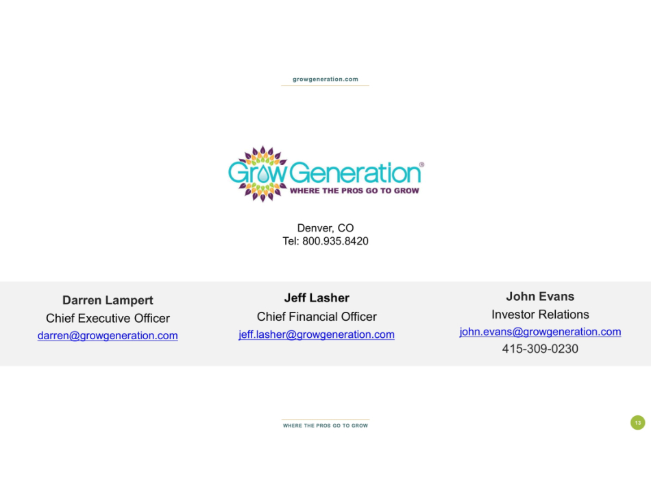 growgeneration.com Darren Lampert Chief Executive Officer darren@growgeneration.com Denver, CO Tel: 800.935.8420 John Evans Investor Relations j ohn.evans@growgeneration.com 415 - 309 - 0230 13 WHERE THE PROS GO TO GROW Jeff Lasher Chief Financial Officer jeff.lasher@growgeneration.com