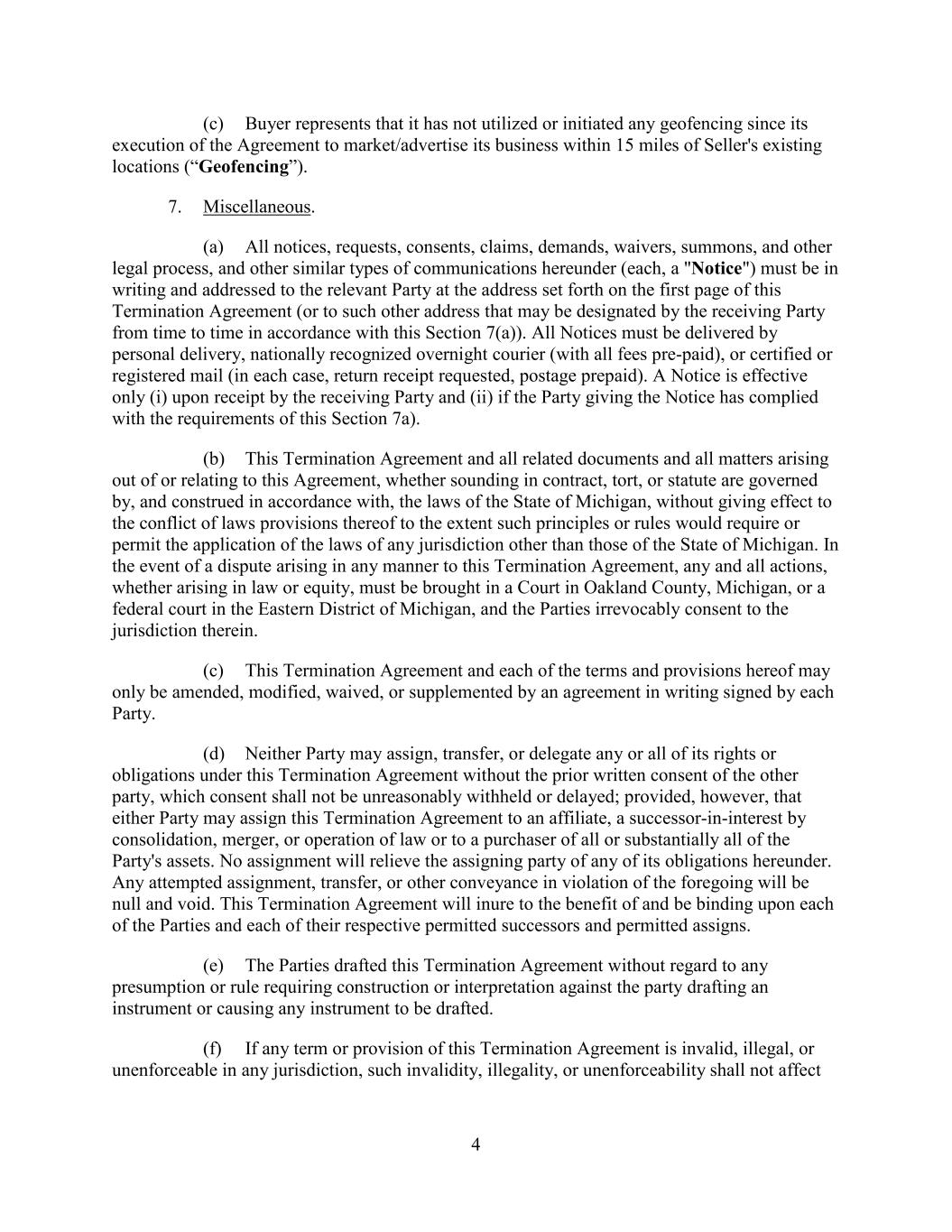 4 (c) Buyer represents that it has not utilized or initiated any geofencing since its execution of the Agreement to market/advertise its business within 15 miles of Seller's existing locations (“Geofencing”). 7. Miscellaneous. (a) All notices, requests, consents, claims, demands, waivers, summons, and other legal process, and other similar types of communications hereunder (each, a "Notice") must be in writing and addressed to the relevant Party at the address set forth on the first page of this Termination Agreement (or to such other address that may be designated by the receiving Party from time to time in accordance with this Section 7(a)). All Notices must be delivered by personal delivery, nationally recognized overnight courier (with all fees pre-paid), or certified or registered mail (in each case, return receipt requested, postage prepaid). A Notice is effective only (i) upon receipt by the receiving Party and (ii) if the Party giving the Notice has complied with the requirements of this Section 7a). (b) This Termination Agreement and all related documents and all matters arising out of or relating to this Agreement, whether sounding in contract, tort, or statute are governed by, and construed in accordance with, the laws of the State of Michigan, without giving effect to the conflict of laws provisions thereof to the extent such principles or rules would require or permit the application of the laws of any jurisdiction other than those of the State of Michigan. In the event of a dispute arising in any manner to this Termination Agreement, any and all actions, whether arising in law or equity, must be brought in a Court in Oakland County, Michigan, or a federal court in the Eastern District of Michigan, and the Parties irrevocably consent to the jurisdiction therein. (c) This Termination Agreement and each of the terms and provisions hereof may only be amended, modified, waived, or supplemented by an agreement in writing signed by each Party. (d) Neither Party may assign, transfer, or delegate any or all of its rights or obligations under this Termination Agreement without the prior written consent of the other party, which consent shall not be unreasonably withheld or delayed; provided, however, that either Party may assign this Termination Agreement to an affiliate, a successor-in-interest by consolidation, merger, or operation of law or to a purchaser of all or substantially all of the Party's assets. No assignment will relieve the assigning party of any of its obligations hereunder. Any attempted assignment, transfer, or other conveyance in violation of the foregoing will be null and void. This Termination Agreement will inure to the benefit of and be binding upon each of the Parties and each of their respective permitted successors and permitted assigns. (e) The Parties drafted this Termination Agreement without regard to any presumption or rule requiring construction or interpretation against the party drafting an instrument or causing any instrument to be drafted. (f) If any term or provision of this Termination Agreement is invalid, illegal, or unenforceable in any jurisdiction, such invalidity, illegality, or unenforceability shall not affect