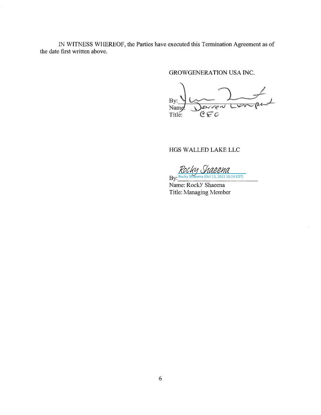 23010980-v2 TERMINATION AGREEMENT This Termination Agreement, dated as of October 12, 2021 (the "Termination Agreement"), between GrowGeneration USA, Inc., a Delaware corporation and the successor by merger of GrowGeneration Michigan Corp., a Delaware corporation ("Buyer"), and HGS Walled Lake LLC, a Michigan limited liability company ("Seller"), and together with Buyer, the "Parties", and each, a "Party"). WHEREAS, the Parties have entered into an Asset Purchase Agreement, dated as of July 27, 2021 (the "Agreement"); and WHEREAS, the Parties hereto desire to terminate the Agreement on the terms and subject to the conditions set forth herein; and WHEREAS, pursuant to Section 6.1 of the Agreement, the Parties may terminate the Agreement by mutual written consent. NOW, THEREFORE, in consideration of the premises set forth above and other good and valuable consideration, the receipt and sufficiency of which are hereby acknowledged, the Parties agree as follows: 1. Definitions. Capitalized terms used and not defined in this Termination Agreement have the respective meanings assigned to them in the Agreement. 2. Termination of the Agreement. Subject to the terms and conditions of this Termination Agreement, the Agreement is hereby terminated as of the date first written above (the "Termination Date"). From and after the Termination Date, the Agreement will be of no further force or effect, and the rights and obligations of each of the Parties thereunder shall terminate, except for (a) any rights and obligations of the Parties that are expressly designated under Section 6.2 to survive the termination of the Agreement and (b) any other rights and obligations of the Parties that come into being or effect upon the termination of the Agreement, in each case under clause (a) and clause (b), subject to the terms and conditions of this Termination Agreement. 3. Mutual Release. (a) In consideration of the covenants, agreements, and undertakings of the Parties under this Termination Agreement, each Party, on behalf of itself and its respective present and former parents, subsidiaries, affiliates, officers, directors, shareholders, members, successors, and assigns (collectively, "Releasors") hereby releases, waives, and forever discharges the other Party and its respective present and former, direct and indirect, parents, subsidiaries, affiliates, employees, officers, directors, shareholders, members, agents, representatives, permitted successors, and permitted assigns (collectively, "Releasees") of and from any and all actions, causes of action, suits, losses, liabilities, rights, debts, dues, sums of money, accounts, reckonings, obligations, costs, expenses, liens, bonds, bills, specialties, covenants, contracts, controversies, agreements, promises, variances, trespasses, damages, judgments, extents, executions, claims, and demands, of every kind and nature whatsoever, whether now known or