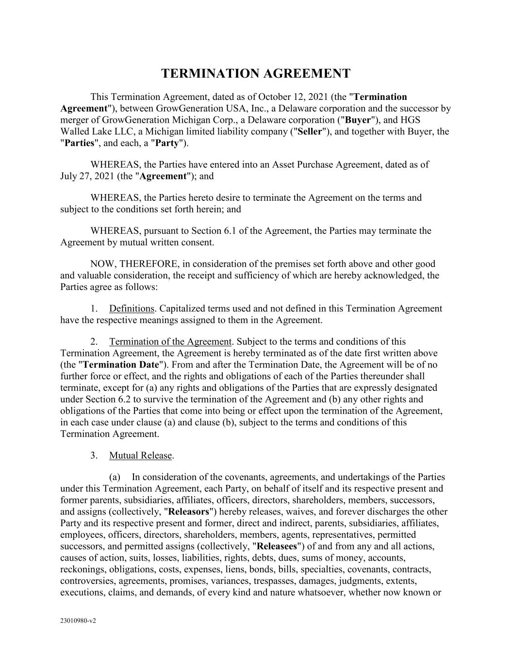 23010980-v2 TERMINATION AGREEMENT This Termination Agreement, dated as of October 12, 2021 (the "Termination Agreement"), between GrowGeneration USA, Inc., a Delaware corporation and the successor by merger of GrowGeneration Michigan Corp., a Delaware corporation ("Buyer"), and HGS Walled Lake LLC, a Michigan limited liability company ("Seller"), and together with Buyer, the "Parties", and each, a "Party"). WHEREAS, the Parties have entered into an Asset Purchase Agreement, dated as of July 27, 2021 (the "Agreement"); and WHEREAS, the Parties hereto desire to terminate the Agreement on the terms and subject to the conditions set forth herein; and WHEREAS, pursuant to Section 6.1 of the Agreement, the Parties may terminate the Agreement by mutual written consent. NOW, THEREFORE, in consideration of the premises set forth above and other good and valuable consideration, the receipt and sufficiency of which are hereby acknowledged, the Parties agree as follows: 1. Definitions. Capitalized terms used and not defined in this Termination Agreement have the respective meanings assigned to them in the Agreement. 2. Termination of the Agreement. Subject to the terms and conditions of this Termination Agreement, the Agreement is hereby terminated as of the date first written above (the "Termination Date"). From and after the Termination Date, the Agreement will be of no further force or effect, and the rights and obligations of each of the Parties thereunder shall terminate, except for (a) any rights and obligations of the Parties that are expressly designated under Section 6.2 to survive the termination of the Agreement and (b) any other rights and obligations of the Parties that come into being or effect upon the termination of the Agreement, in each case under clause (a) and clause (b), subject to the terms and conditions of this Termination Agreement. 3. Mutual Release. (a) In consideration of the covenants, agreements, and undertakings of the Parties under this Termination Agreement, each Party, on behalf of itself and its respective present and former parents, subsidiaries, affiliates, officers, directors, shareholders, members, successors, and assigns (collectively, "Releasors") hereby releases, waives, and forever discharges the other Party and its respective present and former, direct and indirect, parents, subsidiaries, affiliates, employees, officers, directors, shareholders, members, agents, representatives, permitted successors, and permitted assigns (collectively, "Releasees") of and from any and all actions, causes of action, suits, losses, liabilities, rights, debts, dues, sums of money, accounts, reckonings, obligations, costs, expenses, liens, bonds, bills, specialties, covenants, contracts, controversies, agreements, promises, variances, trespasses, damages, judgments, extents, executions, claims, and demands, of every kind and nature whatsoever, whether now known or